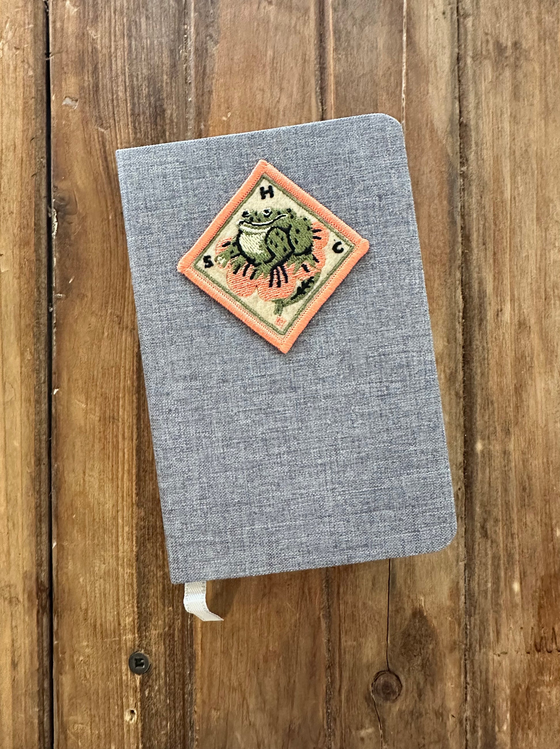 The perfect everyday companion: a pocket-sized notebook covered in a linen blend fabric, with 192 super versatile dotted pages (perfect for doodling or note-taking). White ribbon page keeper is attached. Our "Flower Frog" felt patch is heat-pressed onto the cover as seen in the main product photo.