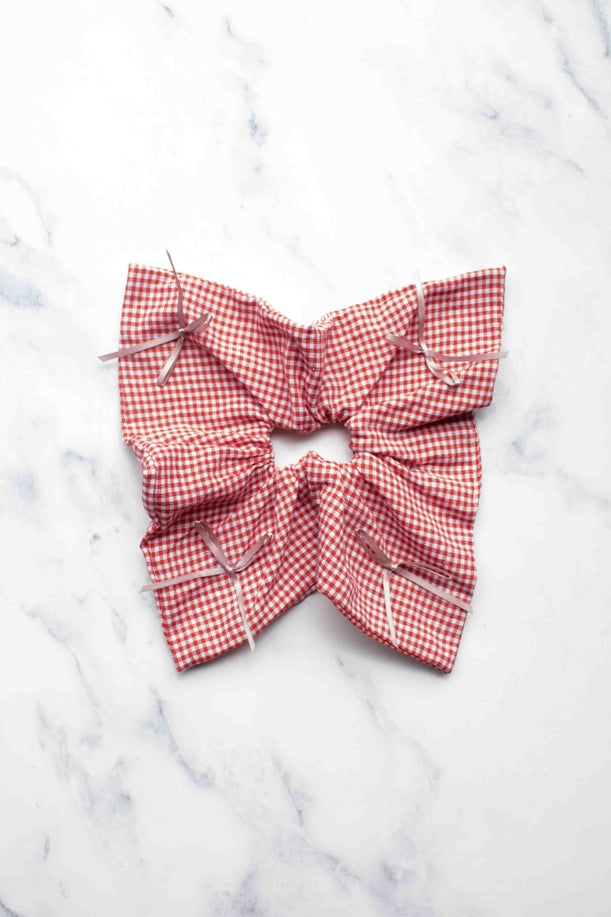 Bring a touch of countryside charm to your look with this adorable square-shaped scrunchie. Made from crisp gingham fabric, this unique piece features soft structure and delicate pink and black ribbon bows for a sweet, handcrafted feel. Its square silhouette adds volume and a quirky twist to your everyday hair game.