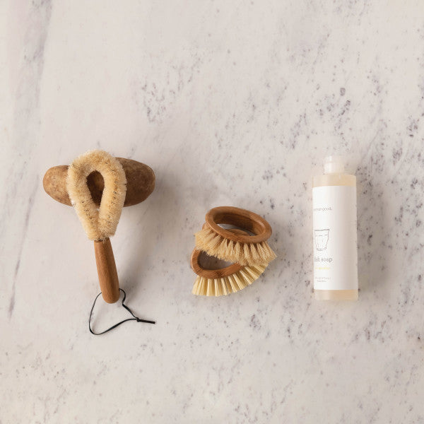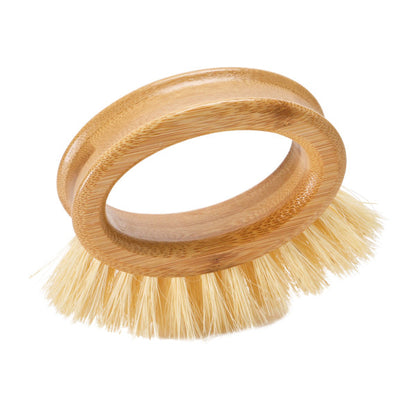 Dishwashing brush with Moso bamboo handle and plant fiber bristles.