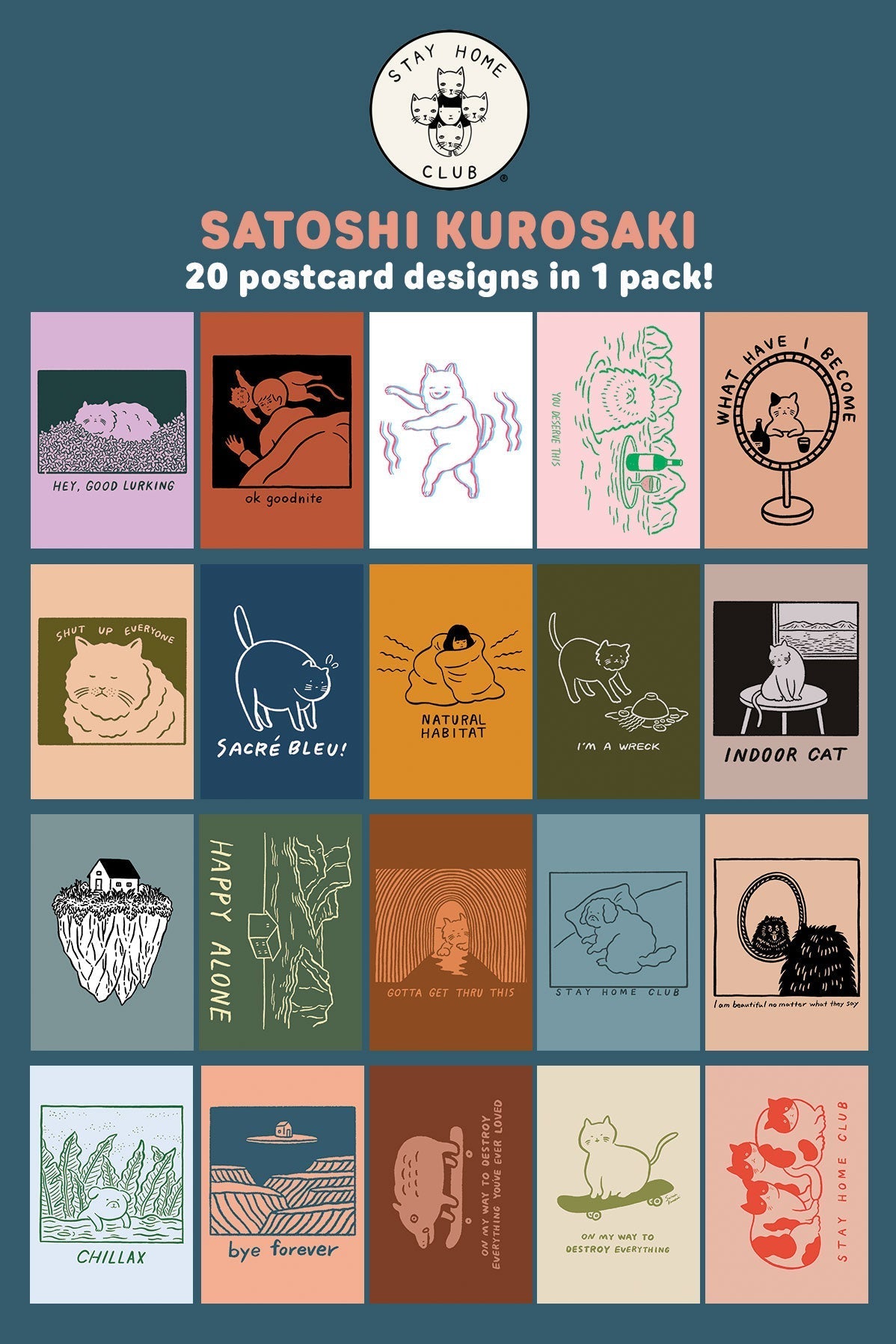 Yep - you get 20 postcards, each with its own design, for framing and hanging or the old fashioned art of corresponding with pals. This pack only contains designs by our longtime contributing artist Satoshi Kurosaki.