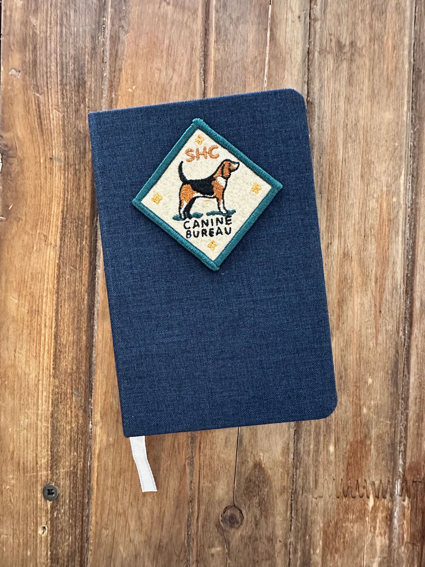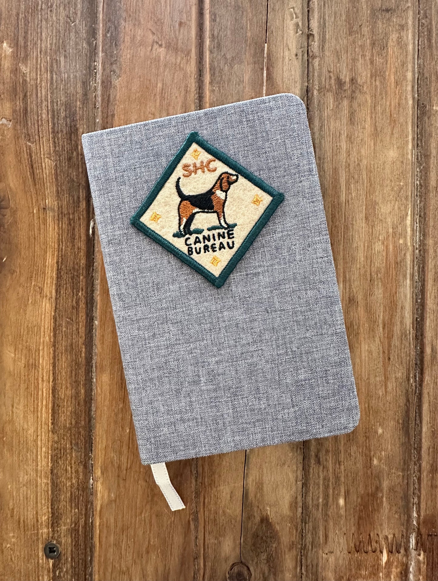 The perfect everyday companion: a pocket-sized notebook covered in a linen blend fabric, with 192 super versatile dotted pages (perfect for doodling or note-taking). White ribbon page keeper is attached. Our "SHC Canine Bureau" felt patch is heat-pressed onto the cover as seen in the main product photo.
