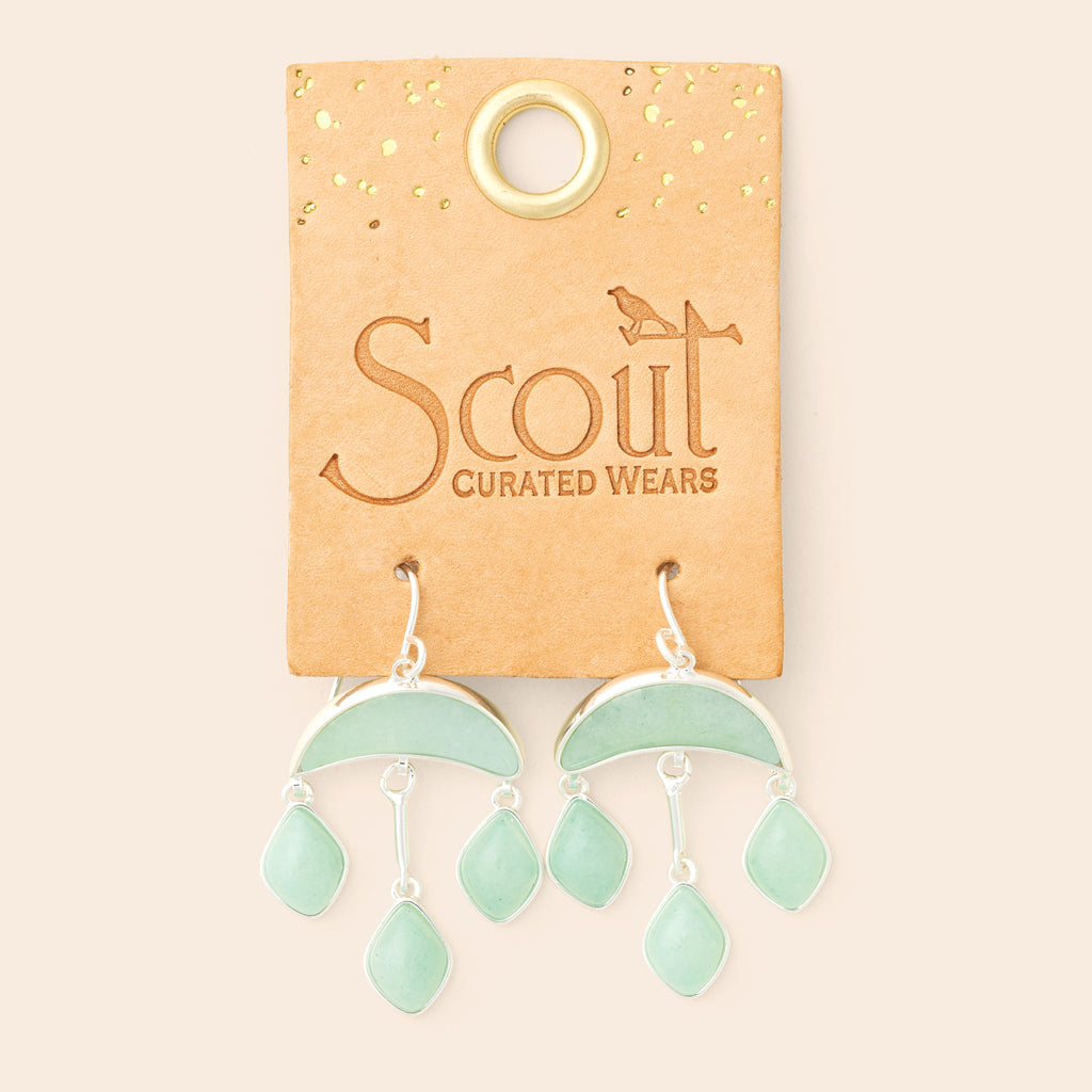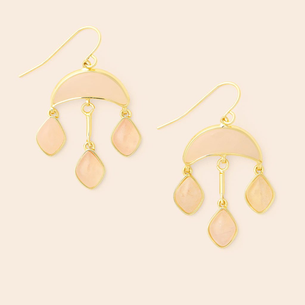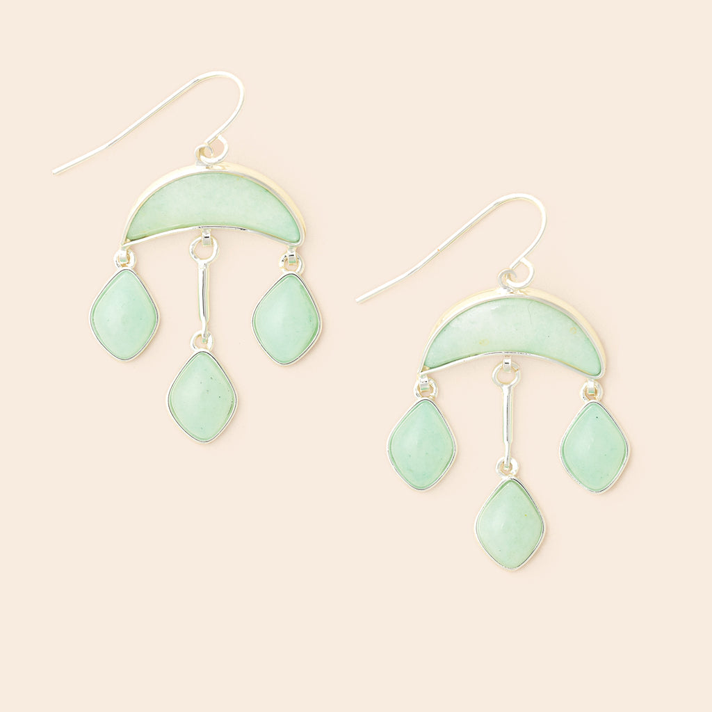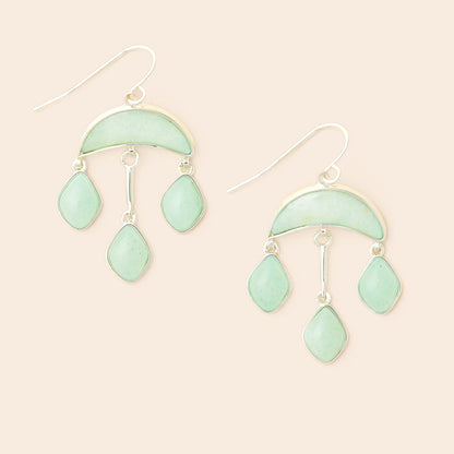 Lightweight earrings featuring semi-precious gemstones and plated brass with a 1" drop and 3/4" diameter.